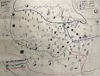 Forest Path is a All Vs One game with one wolf and up to five other players. All players will roll 1D6 in a attempt to make it to the end of the board, while the wolf player will roll 1D6 and attempt to land on the players to eliminate them. Across the board are spaces with either positive chance cards for the players or negative danger cards.